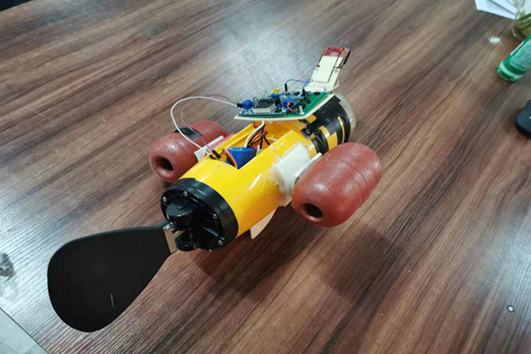 “旅行者”队参赛作品机器鱼要求沿着白色输油管道前进,并且可以准确识别漏油点(用黑点模拟)并报警。比赛采用非对抗比赛形式,机器鱼通过螺旋推进或者仿生的方式进行下潜巡查,不能依靠物理方式接触管道,最终以正确检测漏油点分数、完成比赛分数和计时分三项分数之和作为参赛队伍的竞赛得分。参赛队员由我院四名同学组成,在学院陶晓杰等老师的精心指导下,他们从8月初开始积极备赛,利用暑期时间在工业培训中心进行作品结构设计、软件编程调试等赛前准备。比赛中他们灵活运用所学知识,沉着应赛,经过激烈角逐,最终荣获二等奖荣誉。