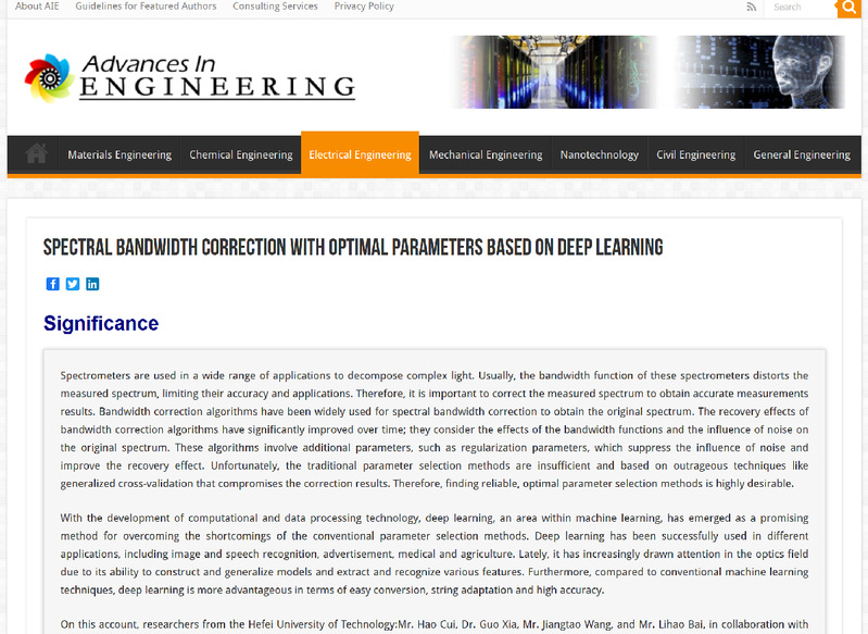 近日,我院夏果老师课题组发表在光学领域国际期刊《Applied Optics》上的研究论文被国际著名工程学科技机构“Advances In Engineering”(简称AIE)遴选为关键科学文章(a key scientific article),并以“Spectral bandwidth correction with optimal parameters based on deep learning”为题在电子工程(Electrical Engineering)栏目进行专题报道。硕士研究生崔浩为第一作者,夏果老师为通讯作者。