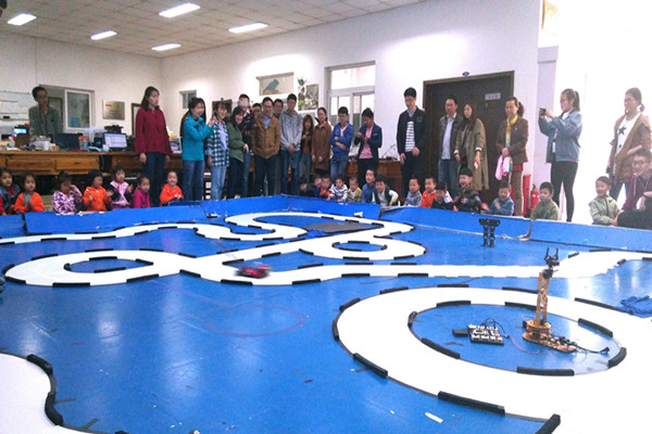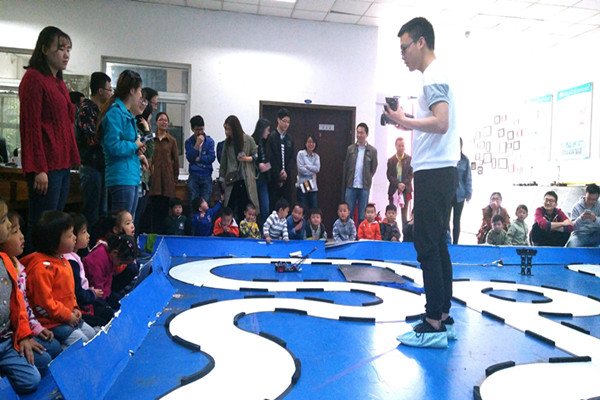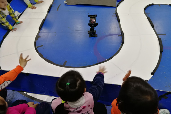 当天上午10点,在热闹欢快的声音中,大学生科技创新基地迎来了一群可爱的小朋友。在幼儿园老师们和基地同学的带领下,小朋友们由创新基地的智能车展示柜开始参观,之后创新基地的同学为小朋友们展示智能车等相关作品。基地同学以生动活泼的语言依次向小朋友介绍了五辆不同形态的无人驾驶智能车,并分别在赛道上演示。当智能车沿着赛道自主循迹行驶,小朋友们稚嫩的欢呼声和热烈的掌声此起彼伏。随后展示的是具有自主避障功能的智能车,这款小车前端萌萌的“大眼睛”,颇受小朋友的欢迎。最后展示是机械手和机器人,机械手随着音乐舞动,并精准抓取物品的展示已得到小朋友们的阵阵赞叹,随后上场的会跳舞、会翻跟头的机器人更是牢牢吸引住小朋友们的眼球。展示临近结束,小朋友们还热情地与机器人道别,场面十分温馨。整个开放日活动持续了近一个小时,取得了圆满成功。