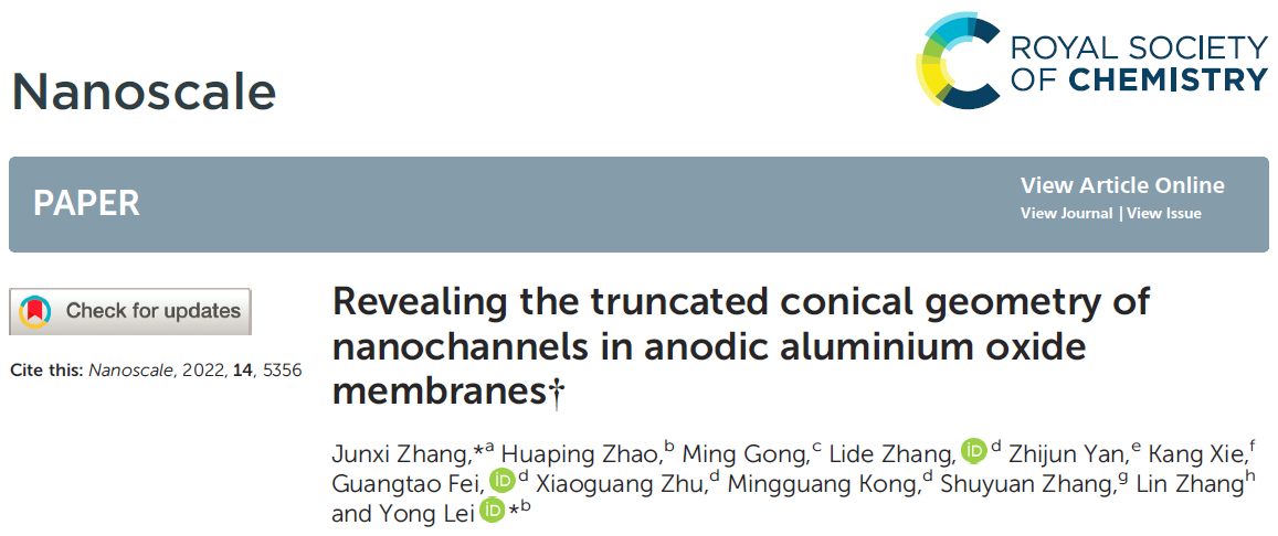 近日,我院光电信息科学与工程系张俊喜研究员课题组在多孔阳极氧化铝膜的纳米通道形状的表征和测量方面取得新进展,相关研究成果以"Revealing the truncated conical geometry of nanochannels in anodic aluminium oxide membranes"为题,发表于Nanoscale (2022, 14: 5356–5368)。