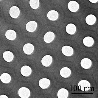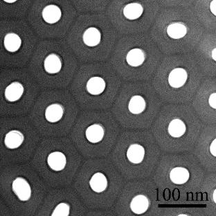 图1. 同一片AAO模板上 (a) 下 (b) 表面透射电子显微镜(TEM)照片