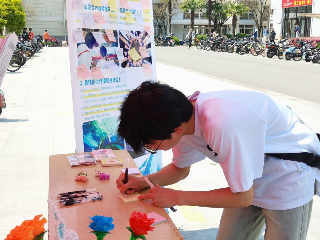 活动现场的宣传海报吸引了过往同学的关注,孤独症也称自闭症,多发生在婴幼儿时期,以社会交往障碍、交流障碍、局限的兴趣、刻板与重复的行为方式等为主要症状,患儿多数还会伴有不同程度的智力发育迟滞。现场的爱心志愿者积极向过往同学们介绍自闭症的相关知识,加强大家对自闭症的认识,同时引导同学们到活动现场,亲手写下对春芽阳光家园的自闭症儿童的祝福,并拍摄照片,记录下同学们对自闭症儿童最美好的祝愿和最暖心的祝福。部分学生了解到本次活动的爱心背景后,深受感动,积极邀请室友、同学到现场参加活动,甚至还有国际友人用外国语言自发地给孩子们写上自己的寄语,为孩子们送上关爱。活动结束后,学院爱心志愿者将把全校同学的祝福代带给春芽家园的孩子们。