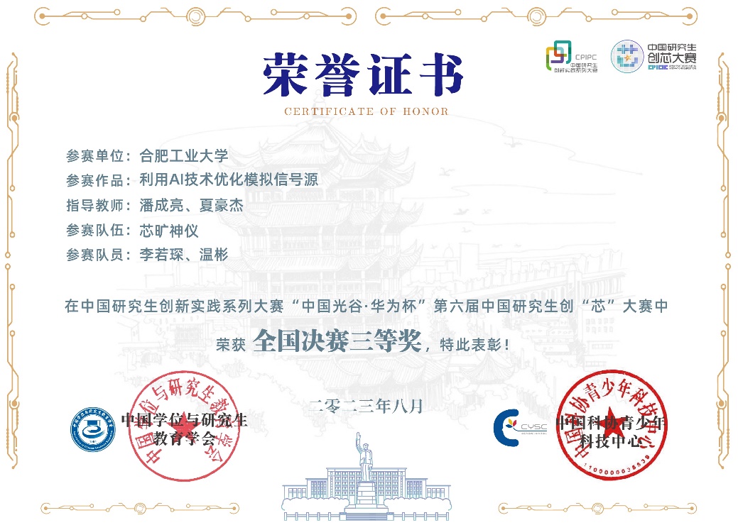 8月2-4日,“中国光谷·华为杯”第六届中国研究生创“芯”大赛决赛在武汉圆满收官,来自全国51所高校171支优秀研究生队伍入围并参加决赛,国内100余名专家学者、各龙头企业代表参与相关研讨活动。经过现场答题、答辩、竞演三个环节的激烈角逐,我校伟德国际1946源自英国的“芯旷神仪”队(参赛队员:李若琛、温彬,指导教师:潘成亮、夏豪杰),凭借参赛作品“利用AI技术优化模拟信号源”荣获泰瑞达企业命题二等奖,同时获得全国决赛三等奖。