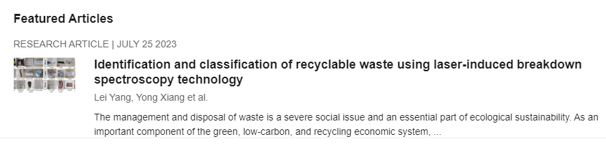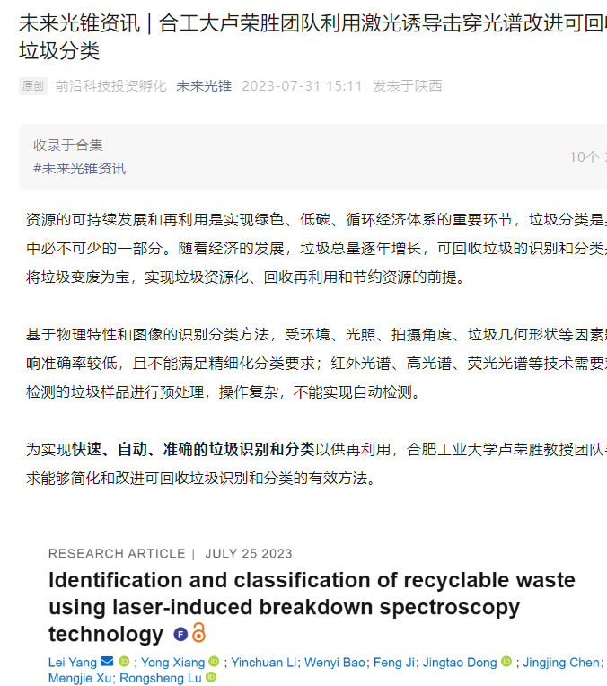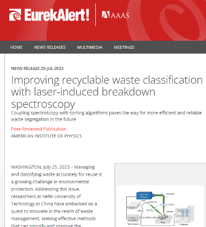 研究团队针对可回收垃圾分类方法受环境影响准确率低、不能实现自动检测、不能满足精细化分类等问题,利用LIBS技术实现了可回收垃圾快速准确分类。利用光谱特征提取与机器学习结合,构建多个分类模型,针对垃圾成分的复杂性和精确分类的重要性,实现了面对消费者层面分类,和面对回收加工工厂层面的精细分类。该论文发表在《AIP Advances》(2023,13(7)),被选为特色文章并在网站主页显示。美国科学促进会(AAAS)主办的科学新闻网EurekAlert!,及多家新闻媒体美国物理学会著名杂志Physics Today、美国知名科普杂志Electro Optics、果壳硬科技-未来光锥对该成果进行了报道。
