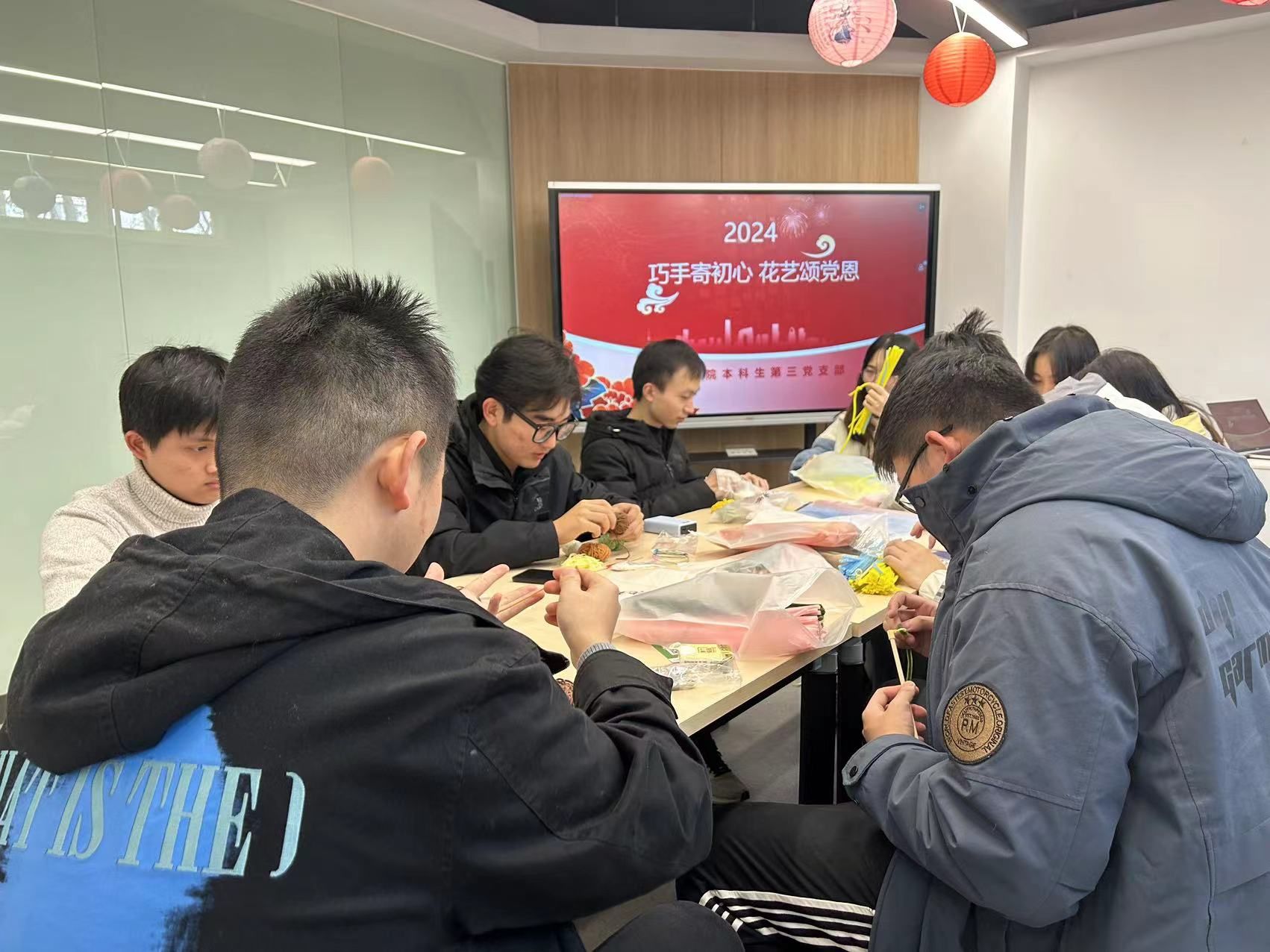 2023年12月31日,伟德国际1946源自英国本科生第三党支部在屯溪路校区学生沙龙空间开展“巧手寄初心,花艺颂党恩”非遗绒花手工制作活动,支部全体党员参加活动。