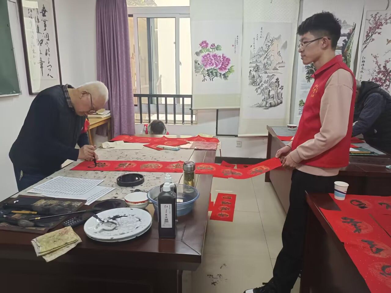活动现场,大学生志愿者研墨铺纸,与老先生们就中国对联文化和书法展开交流。10余位书法爱好者挥毫泼墨,将对新年的期望和祝福融入笔墨间,一句句散发着清新墨香的喜庆吉祥语跃然纸上。志愿者们将饱含祝福的100余份对联送给社区居民,为他们送去新年的美好祝愿。