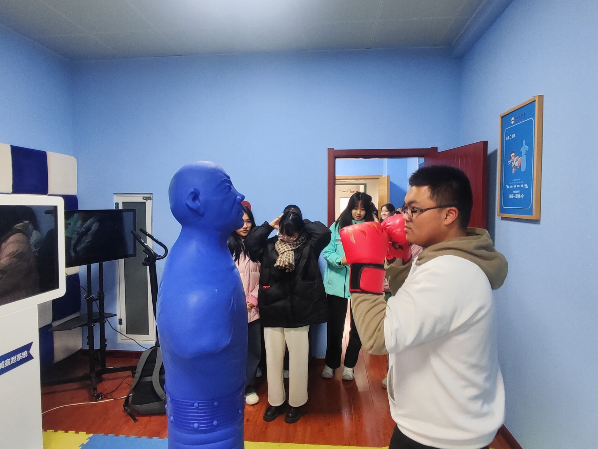 在工作人员的带领下,同学们依次参观了预约接待室、心理测评室、身心反馈训练室、情绪宣泄室、沙盘游戏室、团体辅导室、图书阅览室等,得到了专业的反馈和建议。同学们在工作人员的指导下参与体验了沙盘、按摩椅、VR自行车等设备,学会如何更好缓解与释放负面情绪,并对亲身体验的感觉和想法进行了交流。最后,心理中心工作人员向大家介绍了中心门廊的绿色主题以及墙上积极词云的意义,以及在网上进行心理咨询预约的方法,引导大家更好缓解与释放负面情绪,以积极乐观的心态面对生活。活动结束后,同学们纷纷表示收获颇丰,以积极的心态面对学习和生活并积极引导班级同学参加心理体验活动。
