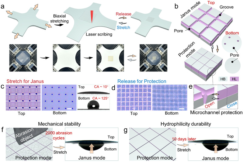 该团队利用飞秒激光刻蚀在预拉伸硅胶基底上制备出由栅格状微槽与微孔构成的三维微通道,并对微槽面进行亲水涂层修饰,而背面仍保持硅胶本征疏水性实现Janus功能。硅胶释放后微槽、微孔封闭保护微通道内的亲水涂层以抵御机械冲击。拉伸工作模式、释放保护模式的按需切换赋予了Janus薄膜机械耐久性,保护模式不仅能抵抗持续性机械摩擦,还能作为储存模式减缓亲水涂层的失效,实现单向水透过功能长期保持(图1)。