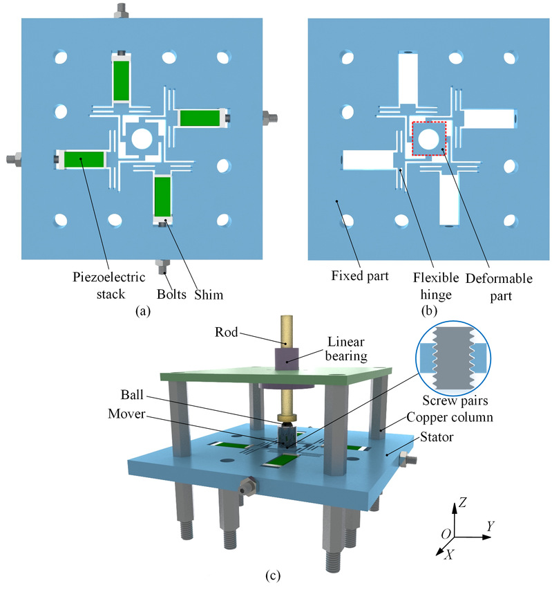 压电驱动技术由于其响应速度快、高分辨率等优势,被广泛地应用于半导体制造装备、生物医学、精密仪器、航空航天等重要领域。然而,现有的压电电机通常只能在准静态或谐振态下运行,难以兼顾高速和高分辨率。针对这一问题,作者深入研究压电电机的工作原理,创新性地提出了一种多模态融合压电驱动技术,通过巧妙设计机械结构,结合仿真分析技术,实现了压电电机在多种工作模式下的高效运行。该压电电机可以分别工作在静态、准静态以及谐振态下,实现静态下微定位,准静态下低速高分辨率运动以及谐振态下高速运动,通过三种工作模式融合驱动,电机能够兼顾高速以及高分辨率输出。实验显示,样机可实现最小位移分辨率为0.5 nm;最高速度为8.5 mm/s,最大负载为3.6 kg,具有良好的综合性能。论文提出的多模态融合压电驱动技术为跨尺度精密驱动带来了全新的解决方案,在下一代(EUV)光刻机、晶圆缺陷检测、扫描探针显微镜等场景有着潜在应用。