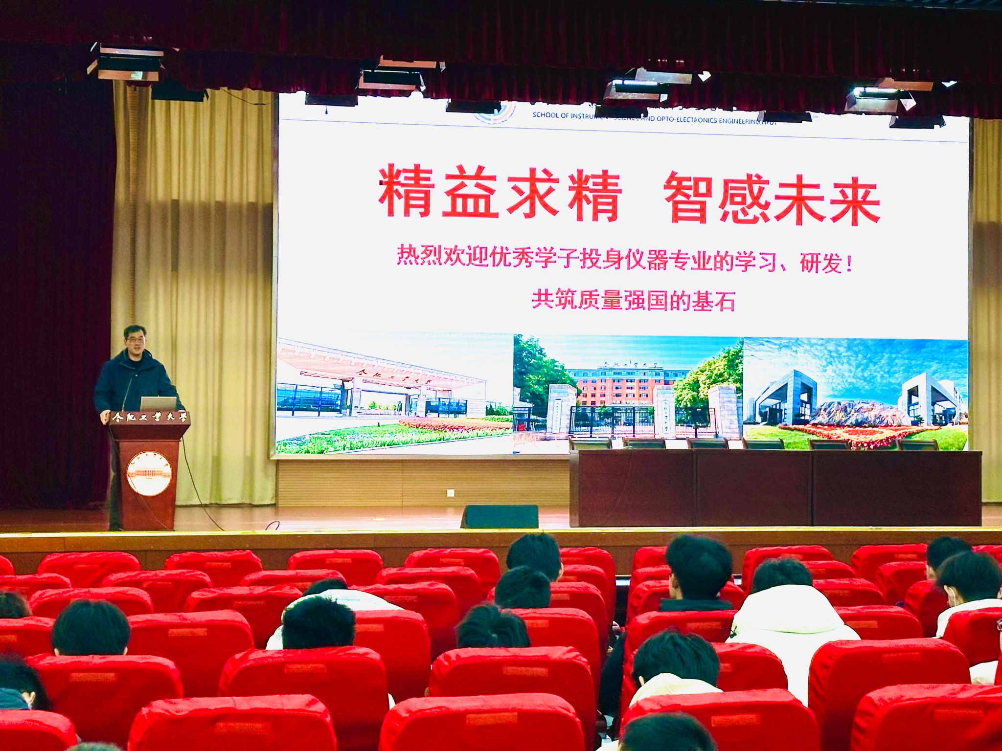 张进教授以“时代与国家的迫切需求”为切入点,深刻剖析了仪器学科的起源与发展,重点讲述了仪器学科的广泛应用和构成体系,强化了学生们对专业的认识和了解。他结合学生目前所处阶段,根据自己的科研经验、研究心得,介绍了挑战杯、大学生创新创业大赛等相关科技创新赛事概况,引导学生明确个人发展目标,激发学生提升自身创新创业能力的内驱力,鼓励学生勇于尝试,敢于创新,学有所得。张进教授勉励我院将“精益求精”的品质内化于心、外化于行,不断提升“追求卓越”的内生动力,矢志追梦,以实际行动践行“工业报国”的崇高理想。